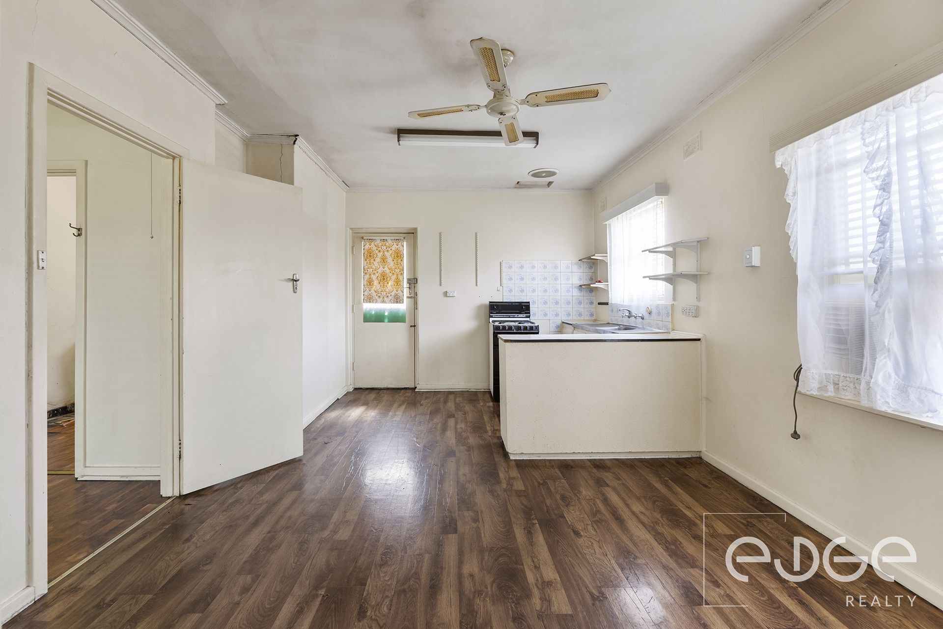 From here, you can flow seamlessly into the adjoining kitchen and meals area through a set of glass sliding doors. The humble kitchen offers a functional layout with a freestanding gas cooktop and oven, painted wood cabinetry, laminate benchtops, and an external access door leading towards the rear verandah - perfect for those who love to entertain. Whether you choose to update and modernise or enjoy as is, this space is designed for convenience and practicality.