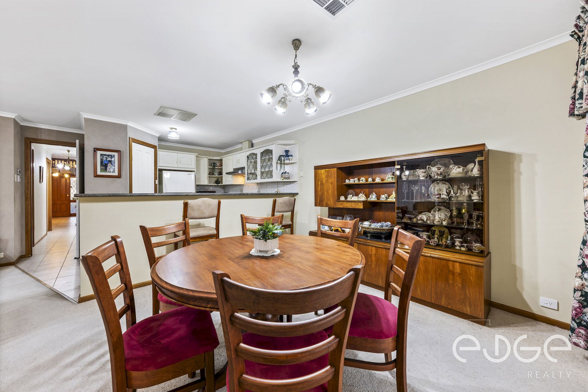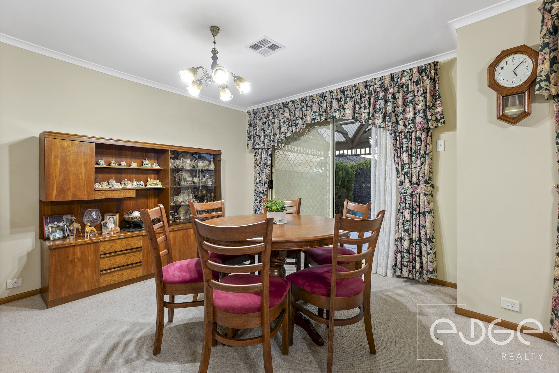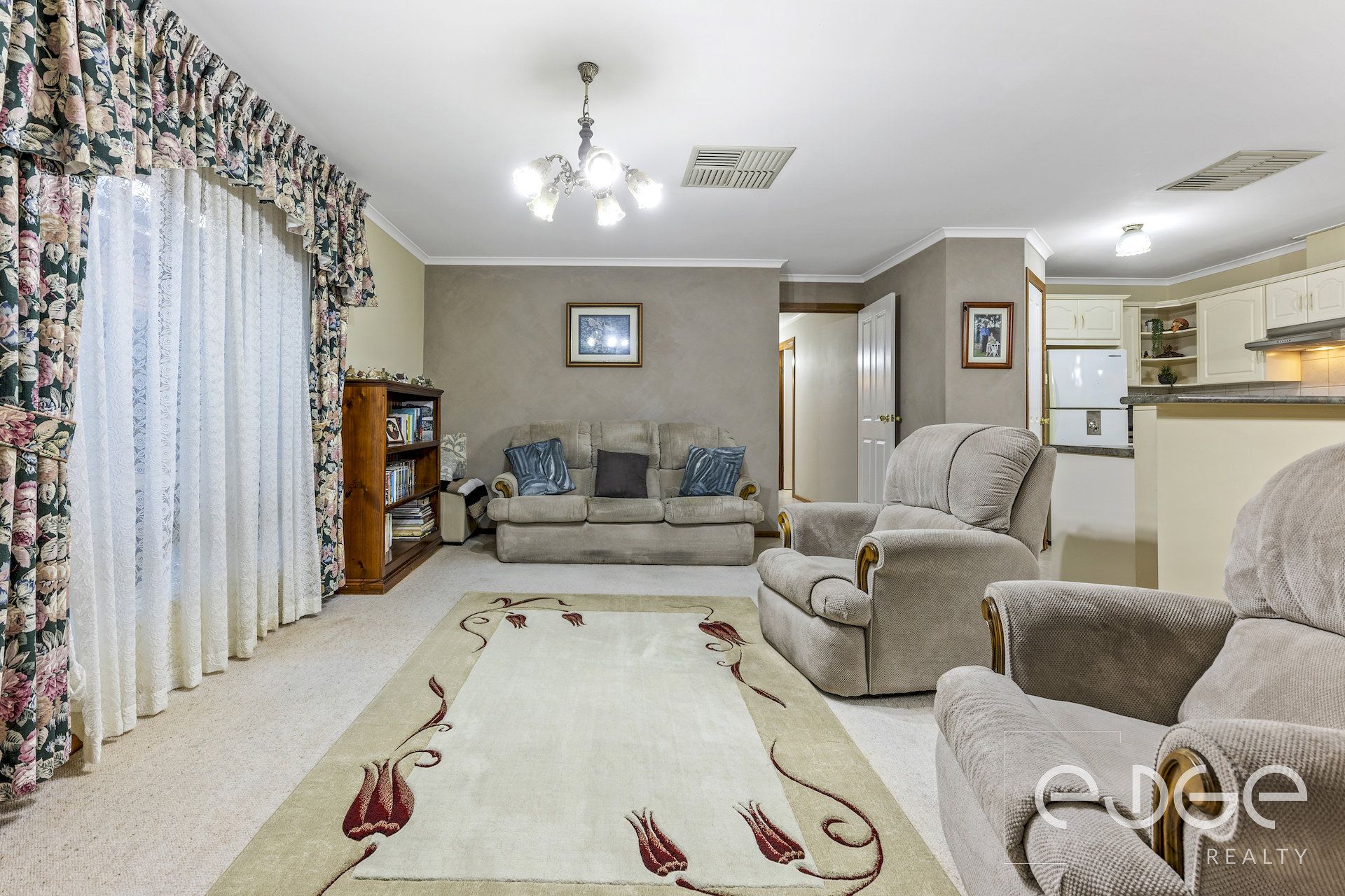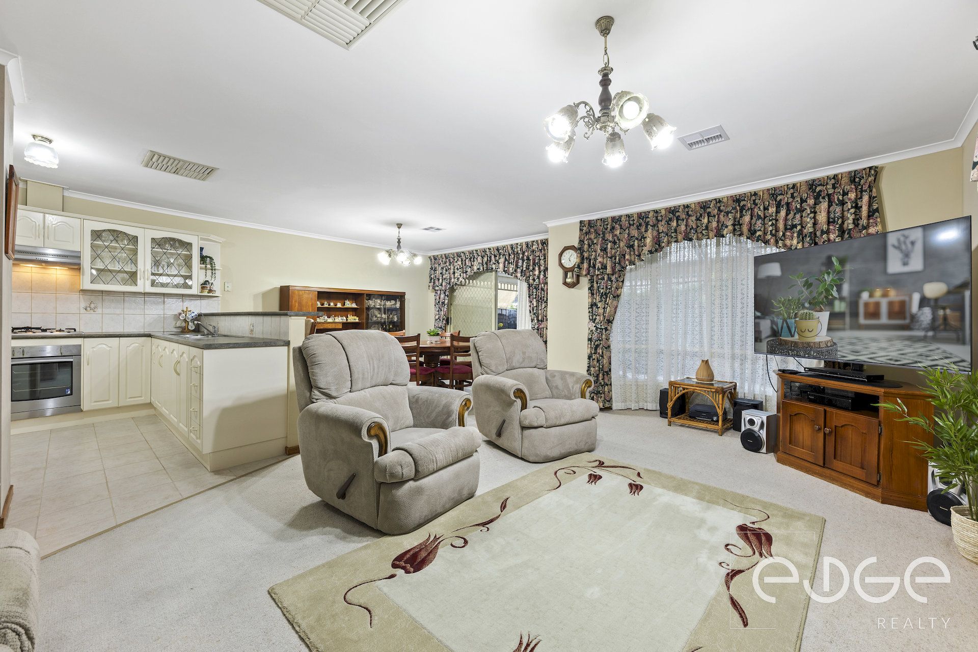 Step into the light-filled open-plan family and meals area, which is bathed in natural light thanks to large windows and a glass sliding door leading to the rear verandah, providing a seamless transition for indoor-outdoor entertaining. Sheer curtains offer privacy without compromising on the incoming light, while the carpet floors provide a soft finish.