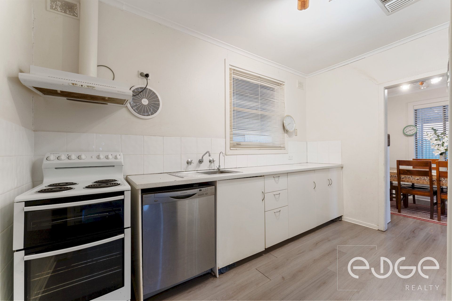 Step inside to a spacious lounge room bathed in natural light, thanks to large windows dressed in sleek venetian blinds. The floating floors add a touch of modernity, while a ceiling fan ensures year-round comfort. Flowing seamlessly into the adjoining dining room, equipped with reverse cycle heating and cooling, this space is perfect for family gatherings or entertaining guests. The dining area connects to a functional galley kitchen, featuring Westinghouse electric appliances, including a cooktop, separate grill, oven, and dishwasher. The 2PAC cabinetry, complete with overhead cupboards and a built-in pantry, offers ample storage for culinary enthusiasts.