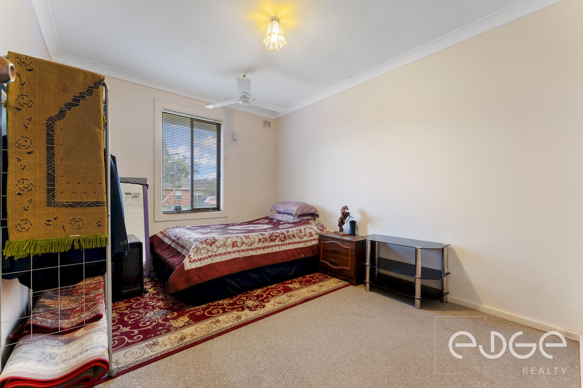The home's three bedrooms, all located in one wing alongside a central bathroom and laundry, provide a practical layout for family living. Each bedroom features cosy carpet flooring and ceiling fans, with the spacious master offering a peaceful retreat.