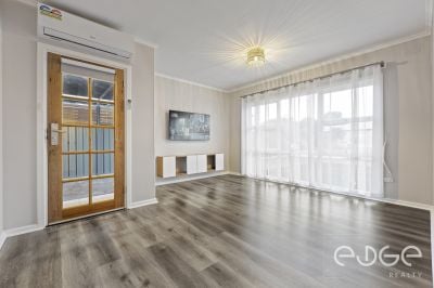 From the moment you arrive, the landscaped gardens, rendered facade and paved driveway create an inviting street presence. Stepping inside, the timber french door opens directly into the spacious lounge room. Here, large windows dressed with sheer curtains flood the space with natural light, while timber-look floating floors, a floating TV cabinet with wall-mounted TV, and a reverse cycle split system ensure year-round comfort.