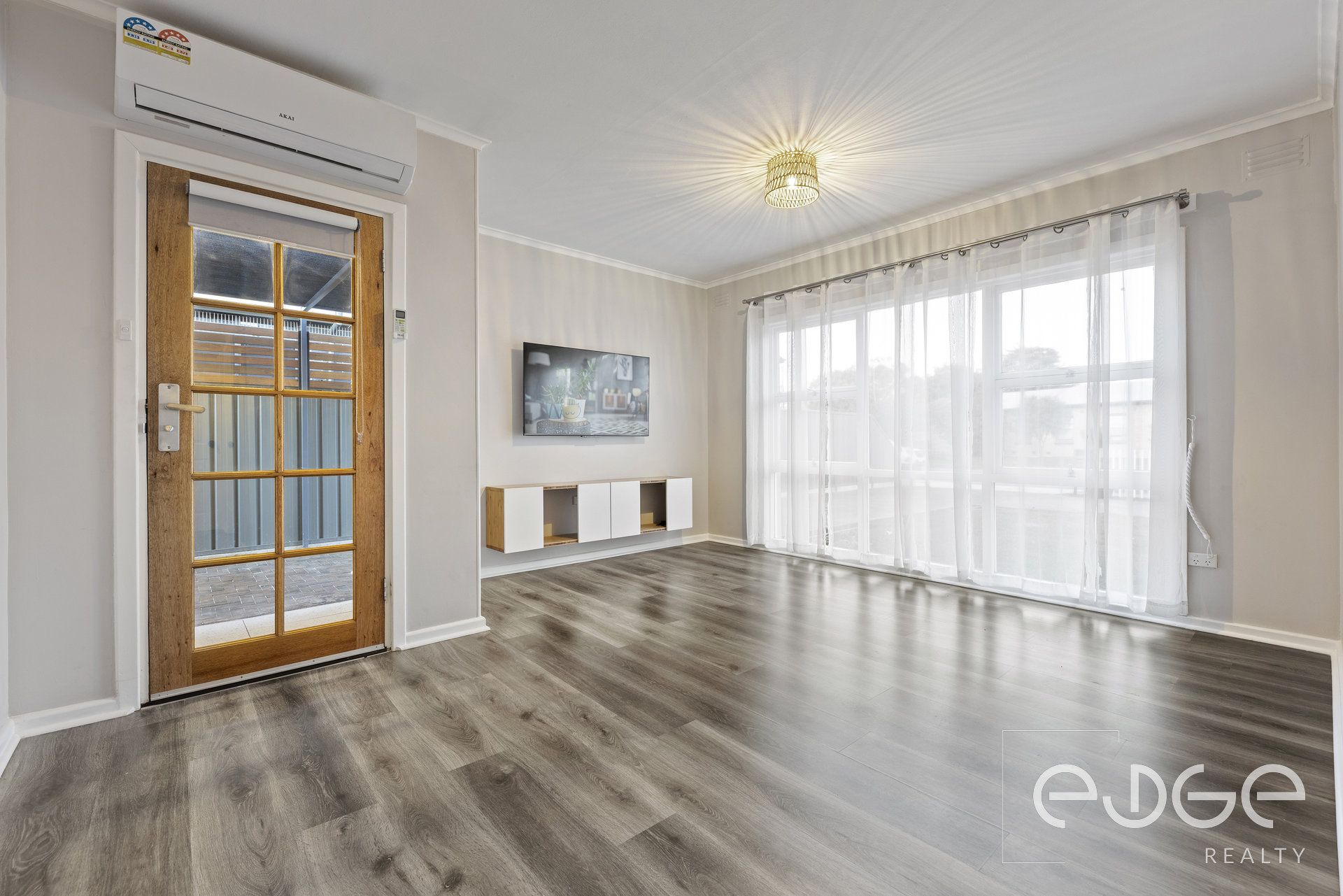 - Light-filled lounge with split system AC, wall mounted TV and floating TV cabinet