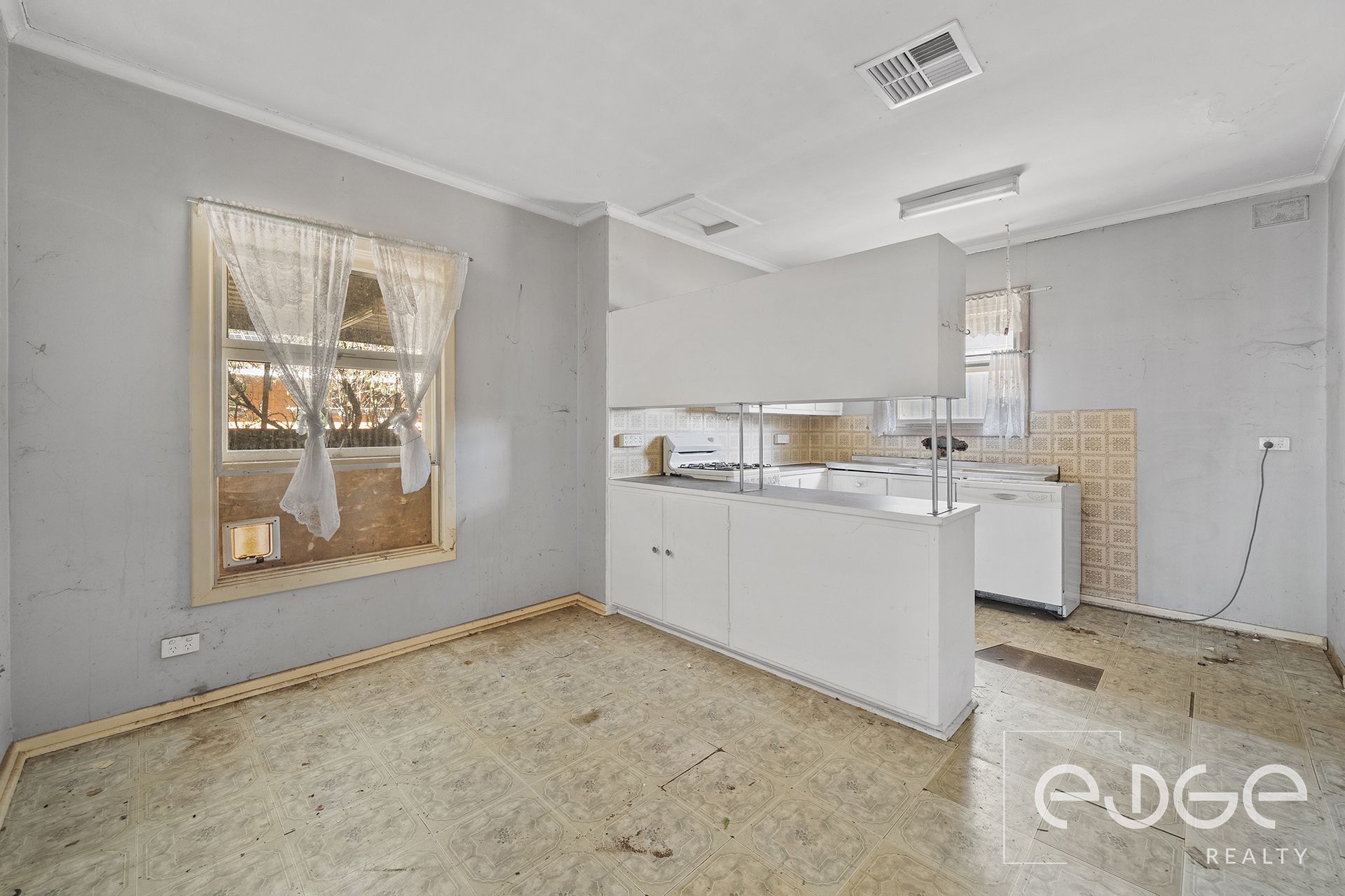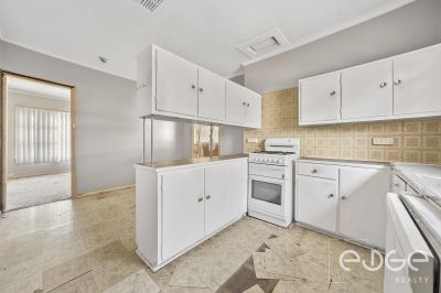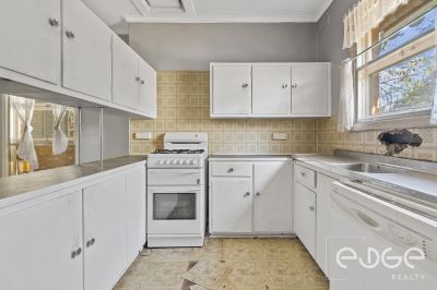 Step inside to discover a spacious front lounge where large windows invite natural light across the room. Downlights enhance the setting while ducted evaporative cooling flows throughout the home, providing comfort during warmer months. The adjoining eat in kitchen retains its retro charm, featuring classic vinyl tile flooring, a gas cooktop and oven, and timber cabinetry with overhead cupboards. With a little creativity, this space has the potential to be transformed into a modern hub for everyday living.