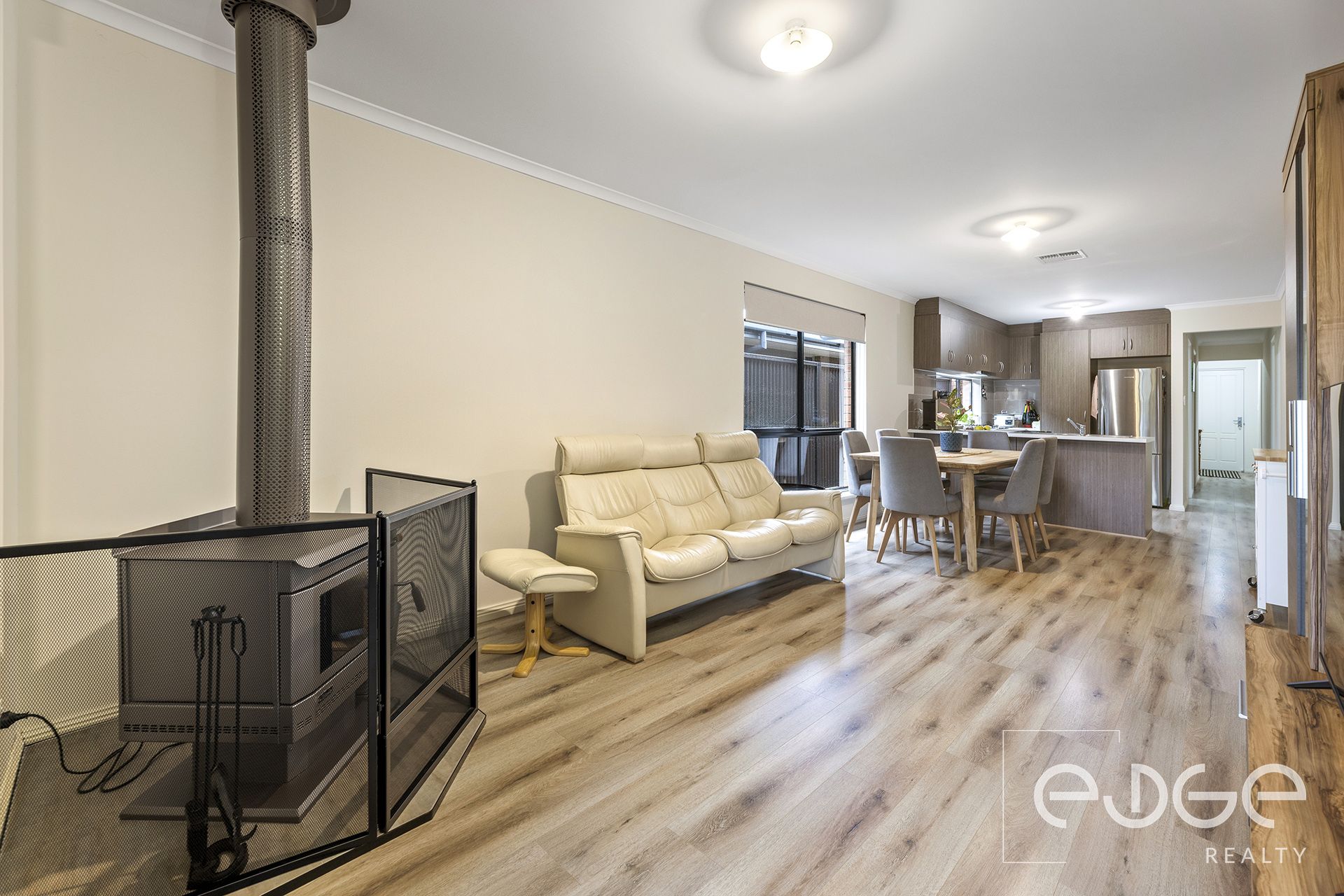At the heart of the home, the open-plan kitchen, dining and living area is filled with natural light and connects seamlessly to the outdoor alfresco space via glass sliding doors. Large windows, floating floors and ducted reverse cycle air conditioning ensure the space remains comfortable year-round while a cosy Ultimate combustion heater adds a touch of warmth and charm during the cooler months. The kitchen is both stylish and functional, featuring a built-in pantry, quality Euro stainless steel appliances including a gas cooktop, electric oven, dishwasher and a contemporary window splashback.