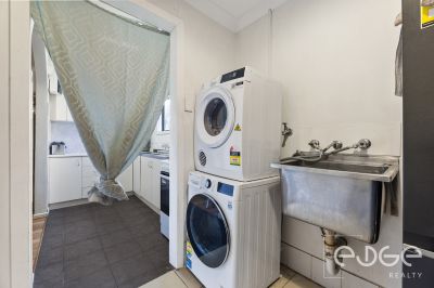 Three generous bedrooms are each serviced by the central bathroom that includes a step-in shower, vanity, and floor-to-ceiling tiles for easy upkeep, while the laundry has external access for added convenience.