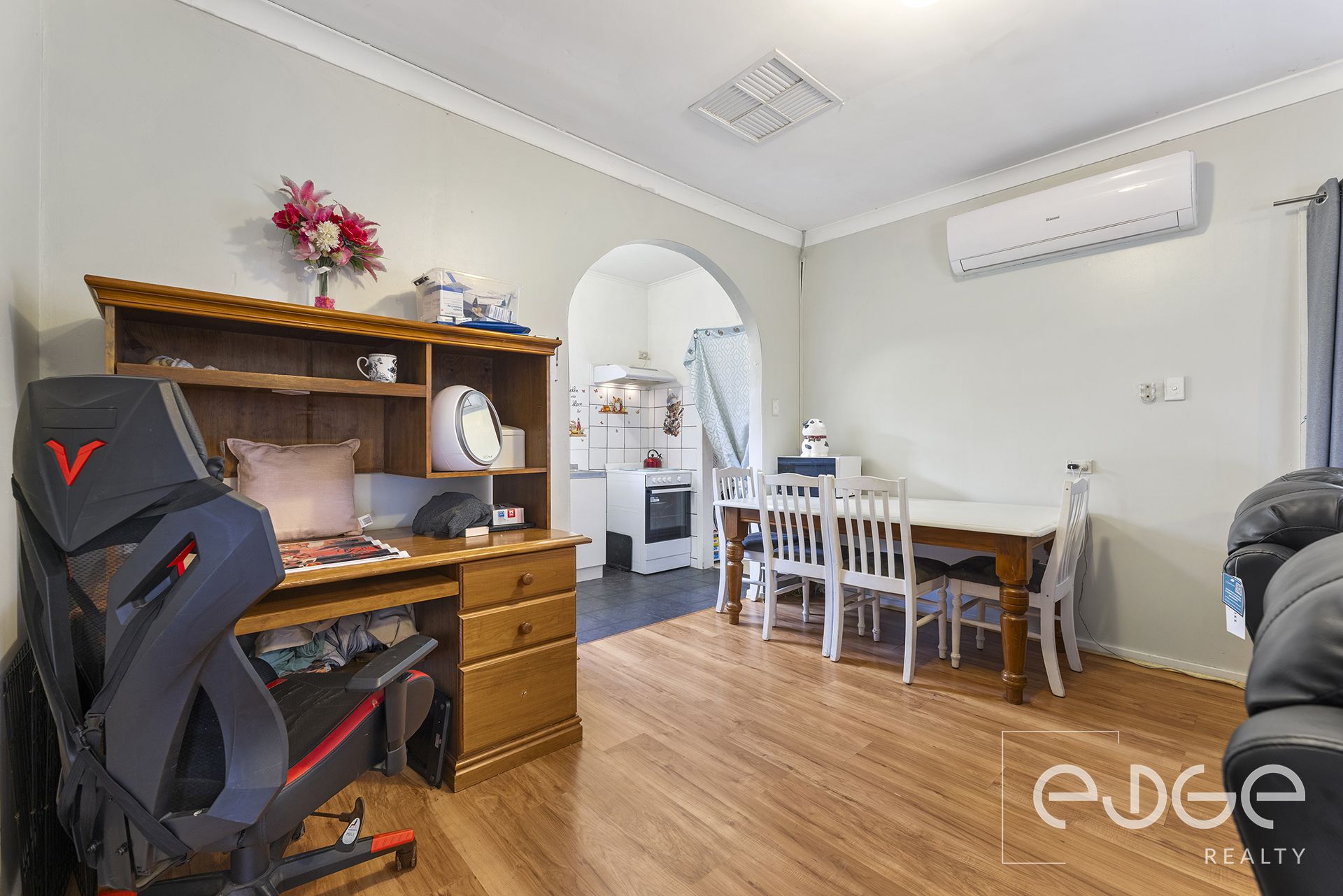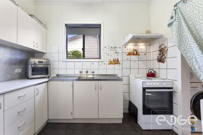 The adjoining kitchen is accessed through a charming archway and provides everything you need for everyday functionality. It features sleek white cabinetry with ample overhead storage, laminate benchtops, tiled splashback, and an electric cooktop and oven.
