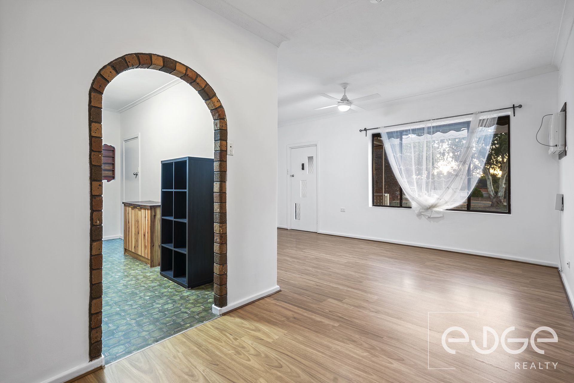 Once you park your car in the double carport, step inside and be greeted by the comfort of reverse cycle heating and cooling that flows throughout the combined lounge and dining area. A crisp colour palette and wood look floating floors run seamlessly throughout the space where there is ample room for the whole family to spread out and relax. From here, you can easily access the kitchen via the striking brick arch way.