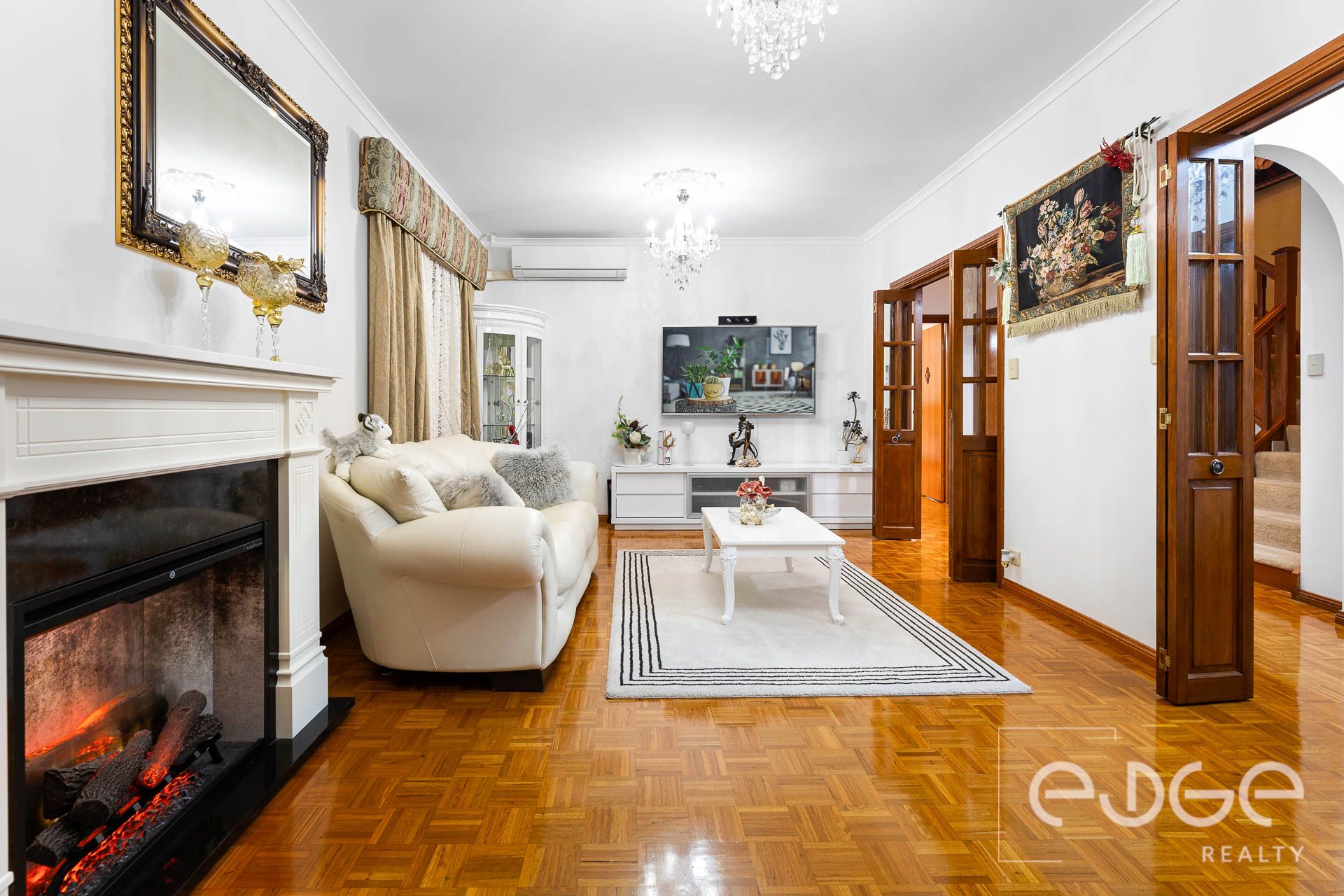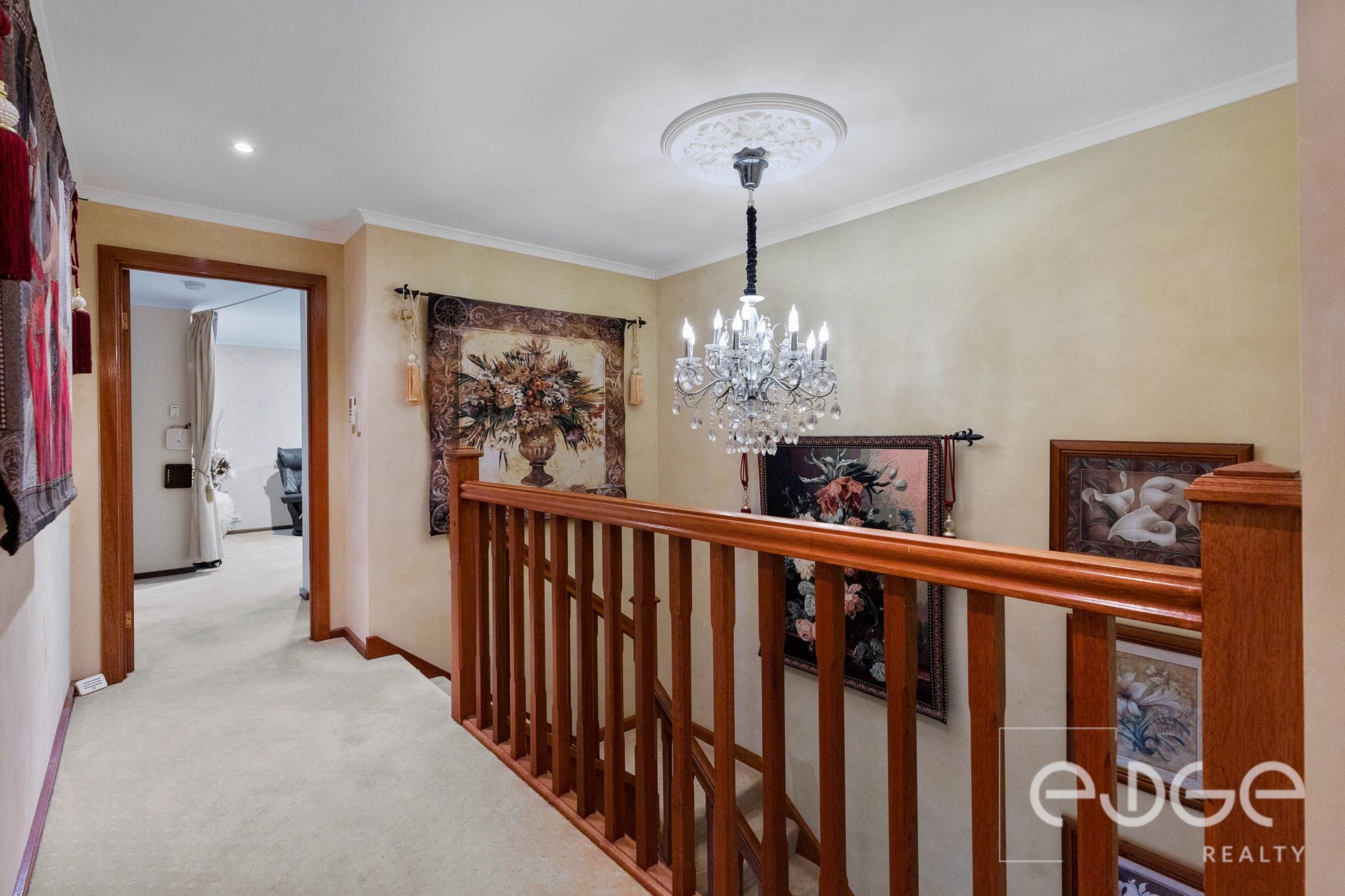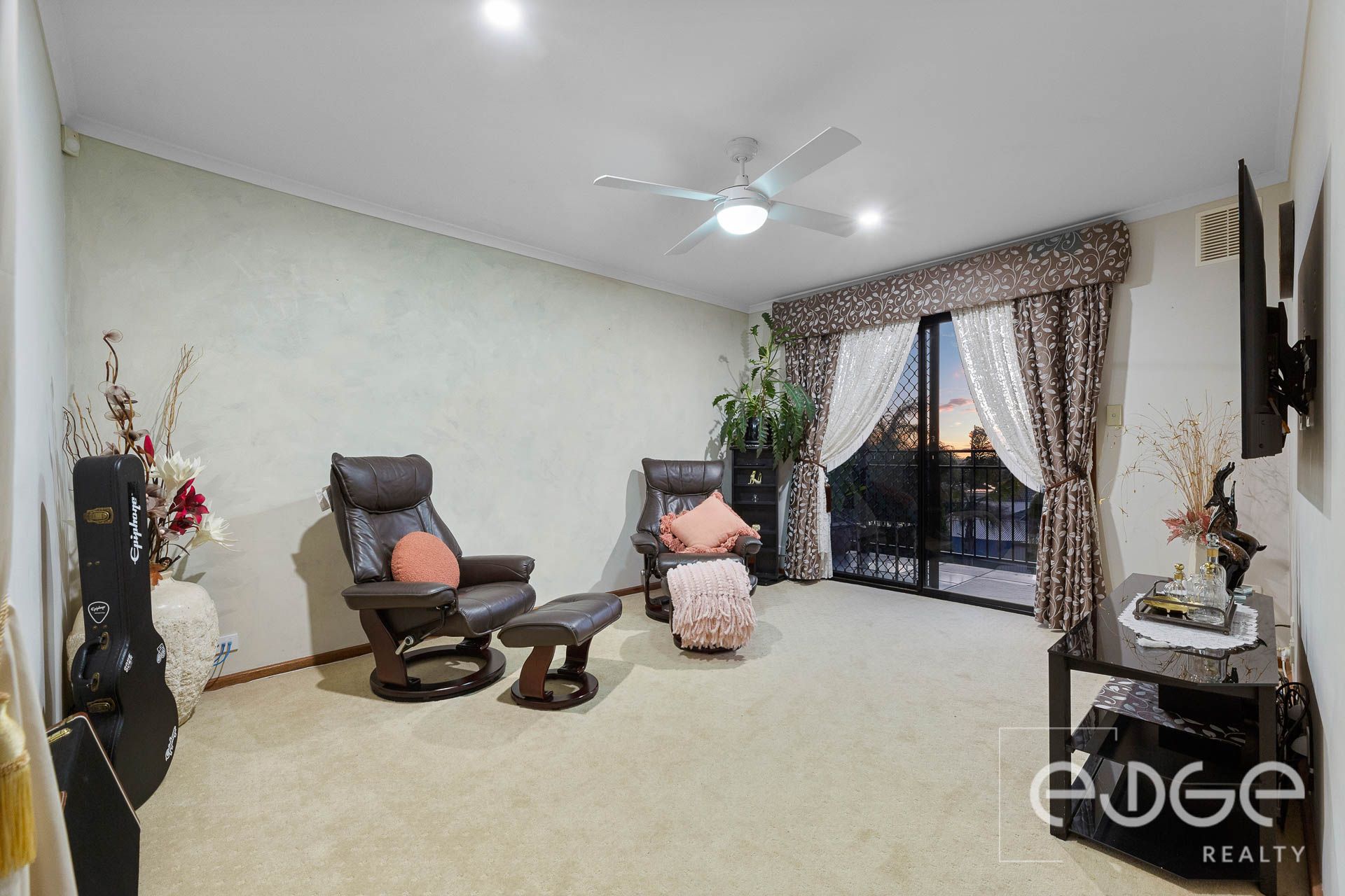 The living spaces are thoughtfully spread over two levels, providing ample room for relaxation and hosting guests. On the lower level, the formal lounge, exudes timeless elegance with ceiling roses, chandeliers, parquetry flooring, and pelmet curtains. This space, equipped with a reverse cycle split system, is accessed through double bi-fold timber doors, offering a spacious yet cosy retreat. At the rear, the open-plan living area features day and night blinds, ducted air-conditioning, and a gas heater. Double glass doors lead to the outdoor entertaining areas, seamlessly blending indoor and outdoor living. The dining area, complete with a detachable table, provides flexibility for larger gatherings. Upstairs, the plush-carpeted rumpus room opens to a private balcony, offering serene sunset views and a lush outlook over the community.