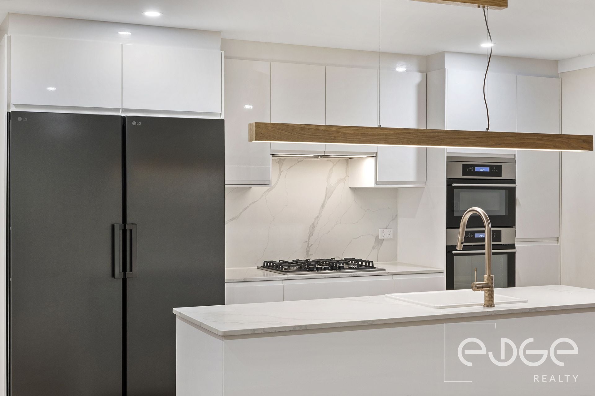 The open plan kitchen overlooks the living space, ensuring the home chef remains involved in family activities. Here, you'll find everything you need to whip up mouth-watering feasts including a brand new fridge, stainless steel gas cooktop, 2 wall ovens and an undermount rangehood. Cleaning up is a breeze with the splashback, integrated dishwasher and large sink with a gooseneck mixer tap. Ample soft-close cabinetry and durable benchtops offer style, storage solutions and plenty of preparation space.