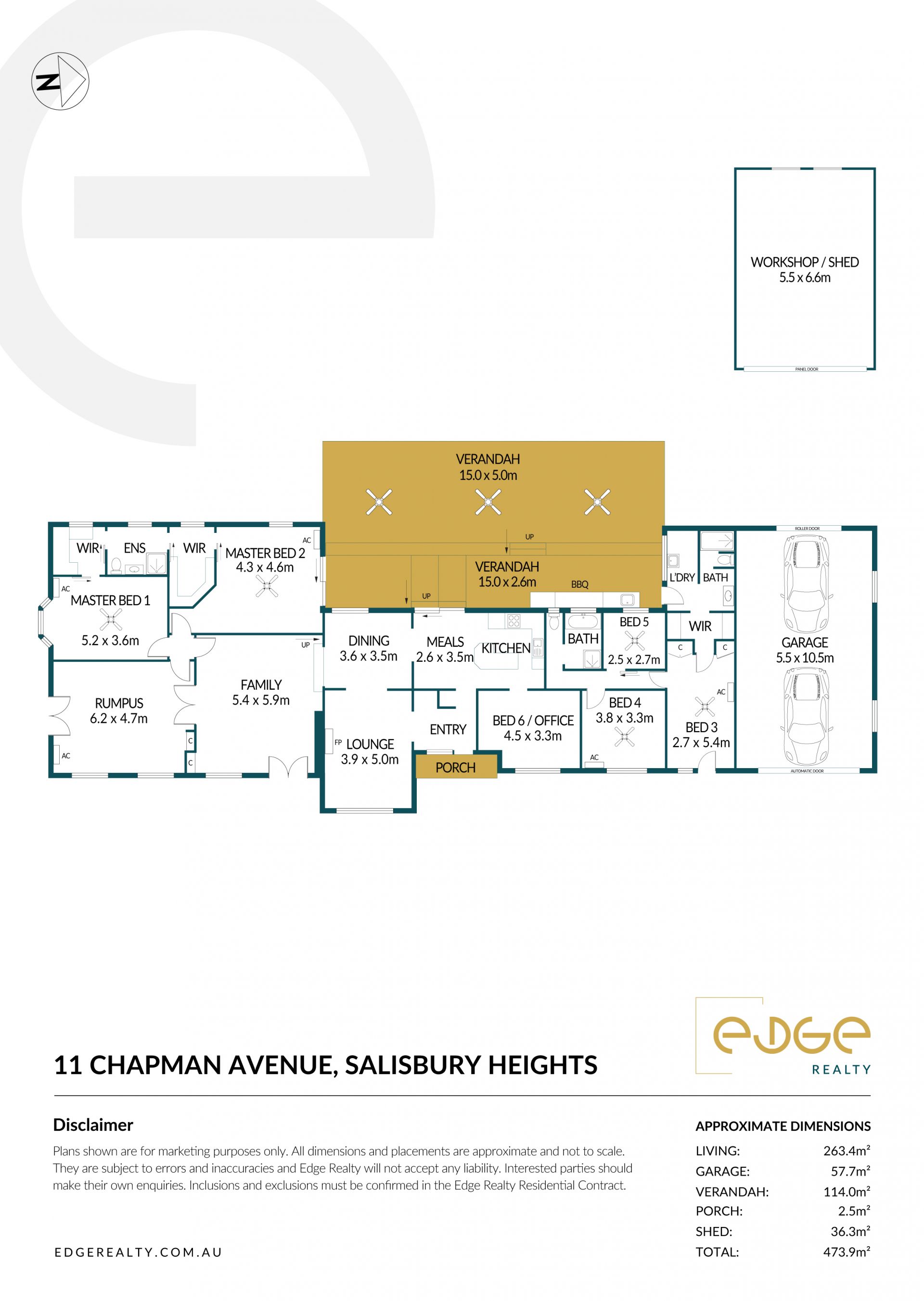 Outside, the expansive verandah overlooks the backyard, offering a tranquil space for alfresco dining or relaxing with family and friends. A large 5.6m x 10.4m garage provides ample room for vehicles, with convenient rear access to a separate 6m x 6m workshop, perfect for hobbyists or tradespeople.