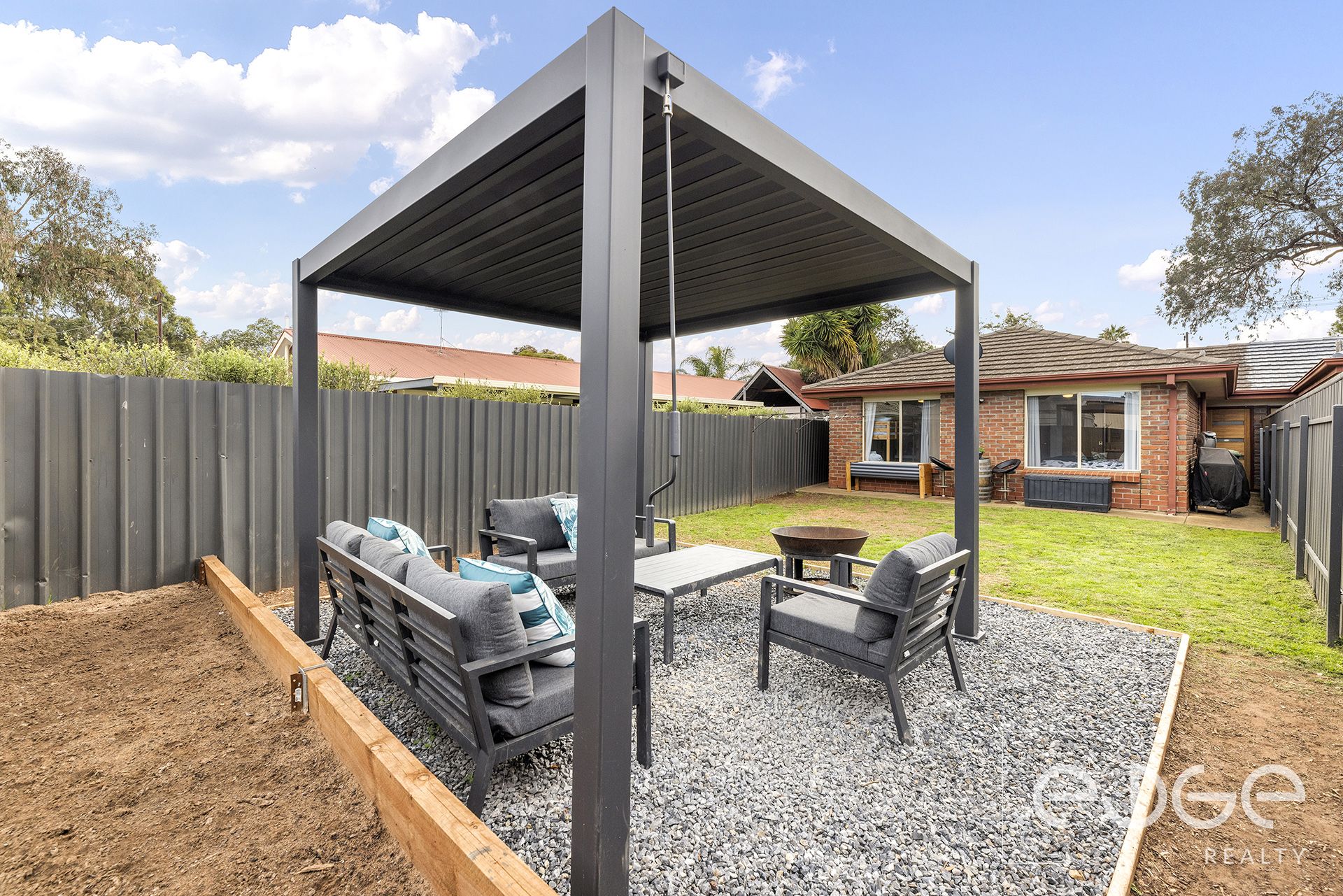 Outside, a luxurious louvered pergola with gravel flooring creates the perfect space for relaxing or bonfire nights with loved ones. The fully fenced yard contains pop-up sprinklers to keep your lawn lush, and offers plenty of room for kids or pets safely play, while the resident green thumb can indulge in their hobby with the dedicated garden bed.