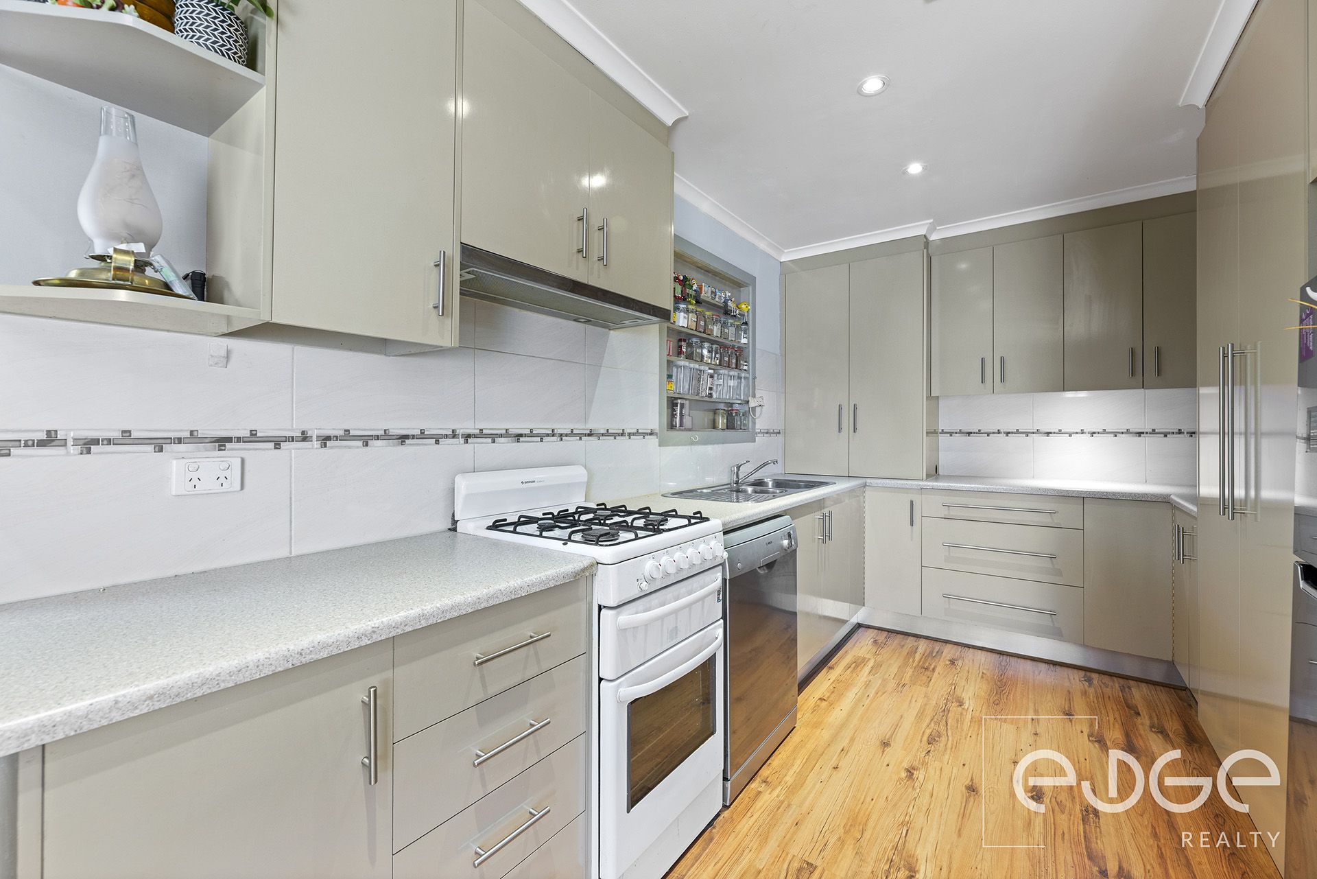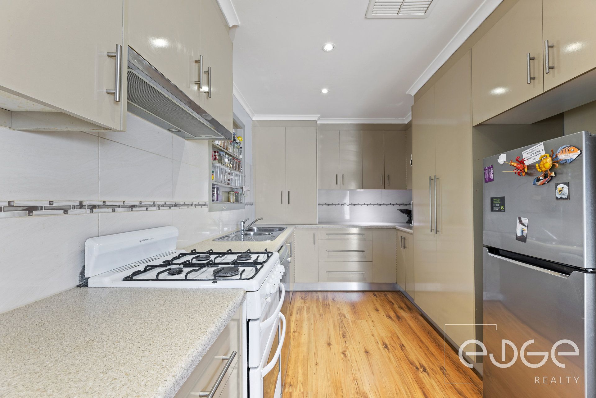 The functional U-shaped kitchen sits at the heart of the home, combining practicality with storage. Built in pantry space, overhead cupboards and a dedicated spice rack keep everything organised, while laminate benchtops, feature tiled splashback and a gas cooktop with oven provide a reliable setting for everyday cooking. Positioned to overlook the living areas, it creates a natural hub for family connection.